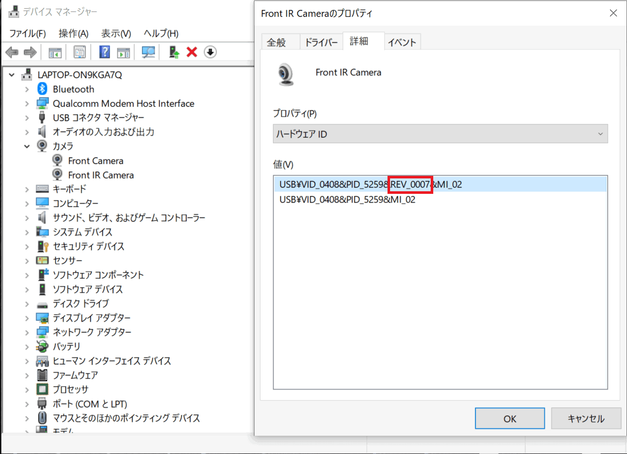 4. [Front IR Camera]のプロパティーが表示されますので、[詳細]タブをクリックします。