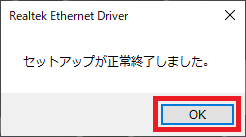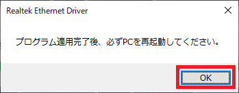 「プログラム適用完了後、必ずPCを再起動してください。」と表示されますので、[OK]をクリックしてください。