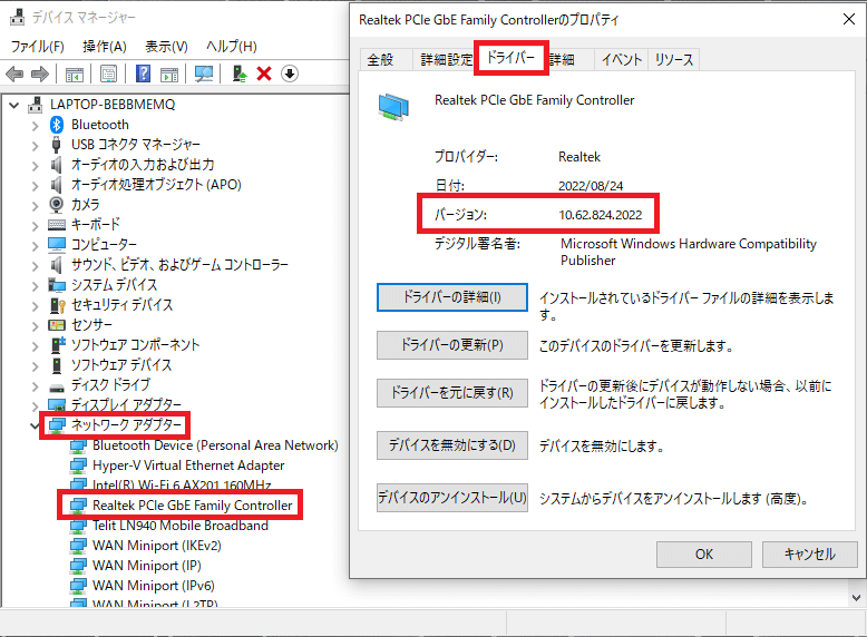 「Realtek PCIe GbE Family Controller」のプロパティーが表示されますので、[ドライバー]タブをクリックします。