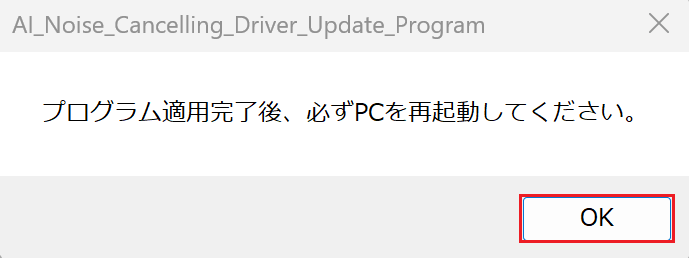 「プログラム適用完了後、必ずPCを再起動してください。」と表示されますので、[OK]をクリックしてください。