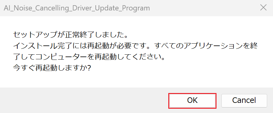 「セットアップが正常終了しました。インストール完了には再起動が必要です。」のダイアログが表示されたら、[OK]をクリックしてください。PCが再起動します。