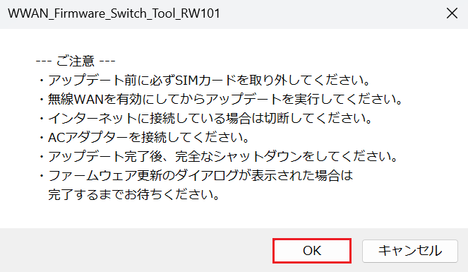 「---ご注意--- ・アップデート前に必ずSIMカードを取り外して下さい。無線WANを有効にしてからアップデートを実行してください。」のダイアログが表示されますので、記載されている内容を確認してから[OK]をクリックしてください。