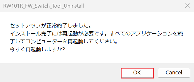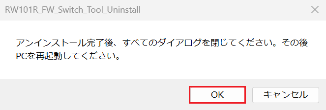 「アンインストール完了後、すべてのダイアログを閉じてください。その後PCを再起動してください。」のダイアログが表示されますので、[OK]をクリックしてください。