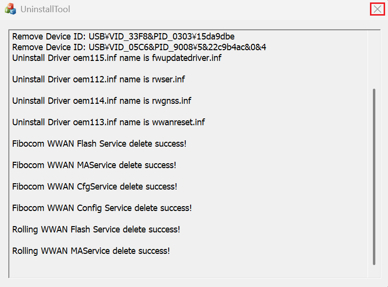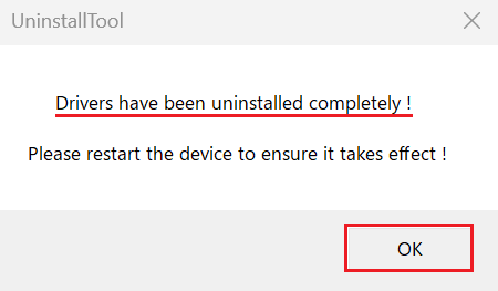 「Drivers have been uninstalled completely!」のダイアログが表示されましたら、[OK]をクリックしてダイアログを閉じてください。 また、もう一つのダイアログも、右上の[X]をクリックして閉じてください。