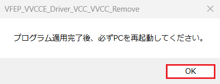 「プログラム適用完了後、必ずPCを再起動してください。」と表示されますので、[OK]をクリックしてください。