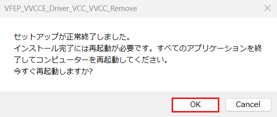 ※「セットアップが正常終了しました。インストール完了には再起動が必要です。」のダイアログが表示された場合は、[OK]をクリック後、PCが自動的に再起動します。