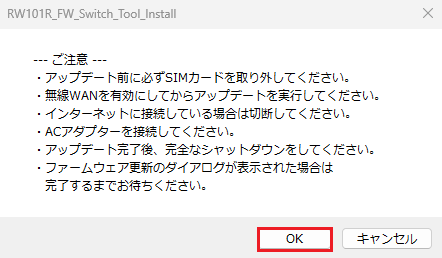 「---ご注意--- ・アップデート前に必ずSIMカードを取り外して下さい。」のダイアログが表示されますので、記載されている内容を確認してから[OK]をクリックしてください。