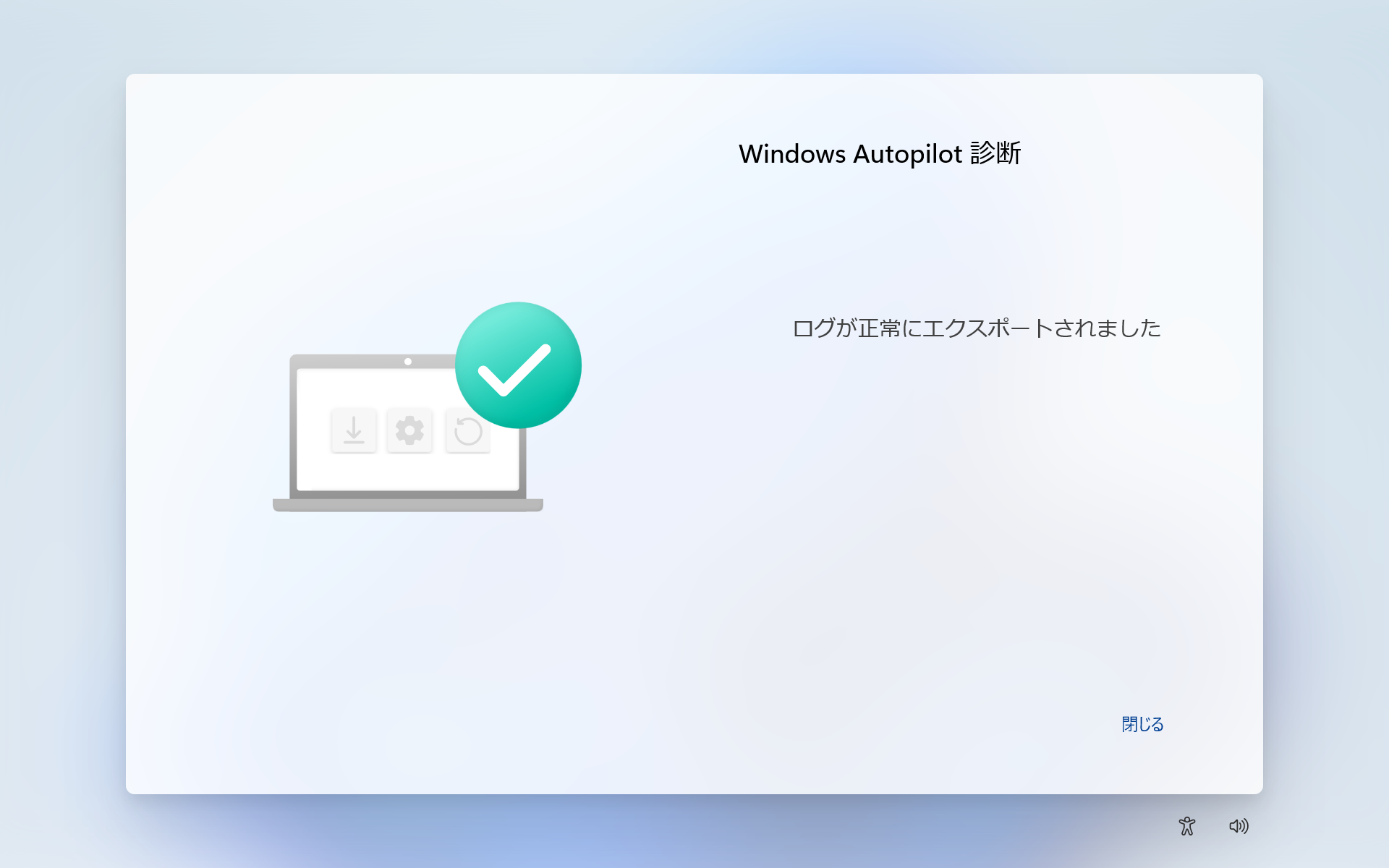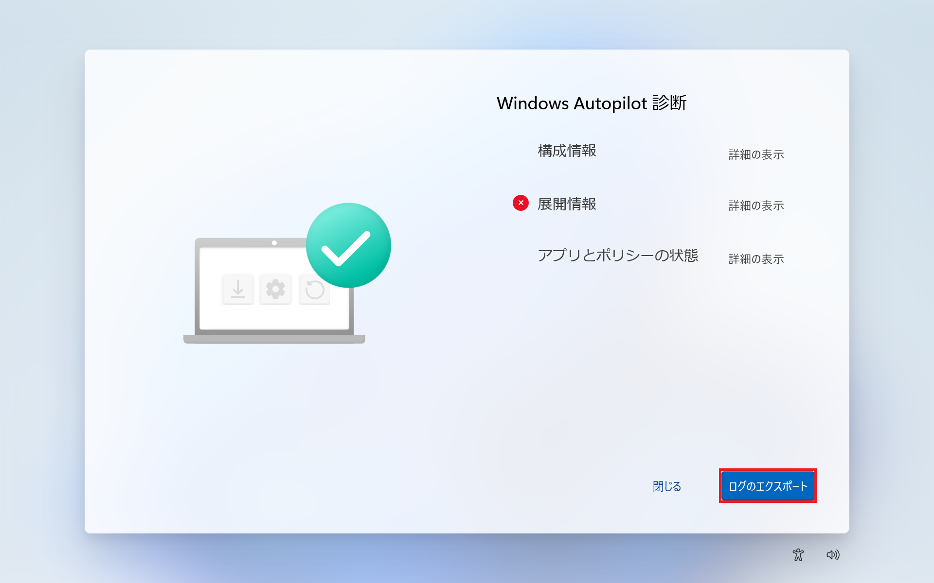 「Windows Autopilot 診断」の画面が表示されますので、準備したUSBメモリーを接続後、[ログのエクスポート]をクリックします。