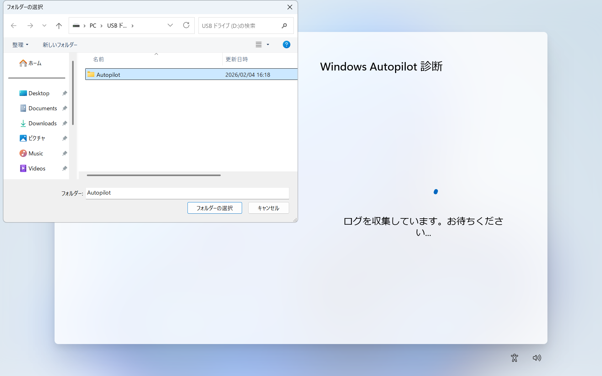 「フォルダーの選択」画面が表示されますので、あらかじめ準備したフォルダー(この例では「AutoPilot」フォルダー)を選択し、[フォルダーの選択]をクリックします。