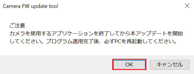 「Camera FW update finished.」と表示された後、「セットアップが正常終了しました。」のダイアログが表示されたら、