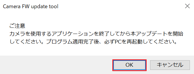 「Camera FW update finished.」と表示された後、「セットアップが正常終了しました。」のダイアログが表示されたら、アップデートは正常に完了しています。[OK]をクリックしてください。PCが再起動します。