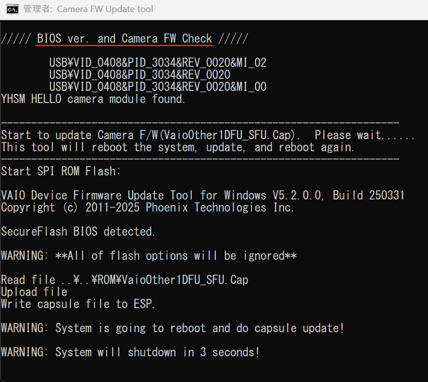 「BIOS ver. and Camera FW Check」の画面が表示され、プログラムの適用が開始されますのでそのまましばらくお待ちください。