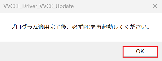 「プログラム適用完了後、必ずPCを再起動してください。」と表示されますので、[OK]をクリックしてください。