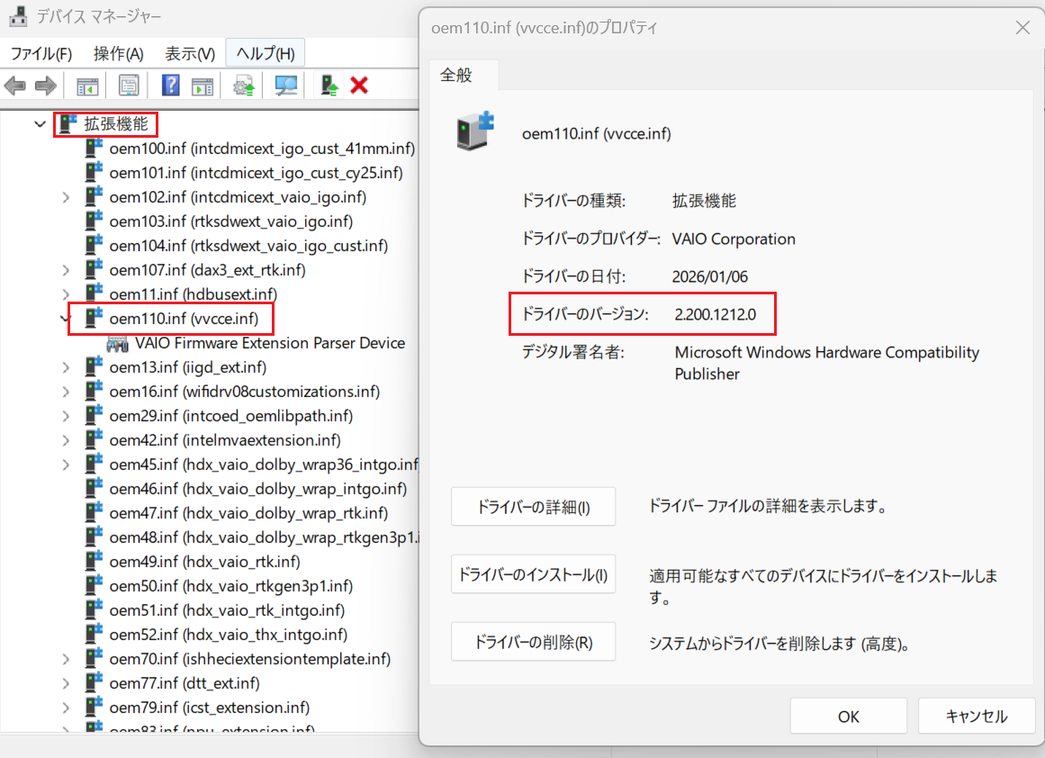 「oem**.inf(vvcce.inf)」のプロパティが表示されますので、バージョンが ”2.200.1212.0”となっていれば正常に適用されています。